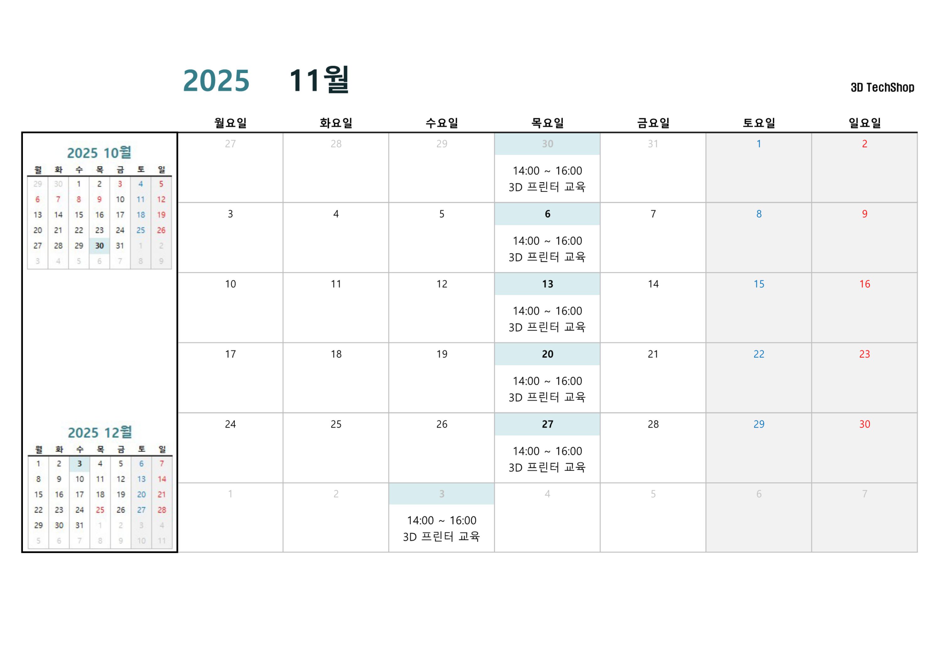 ★ 3D테크숍 10~12월 교육 일정표 ★
